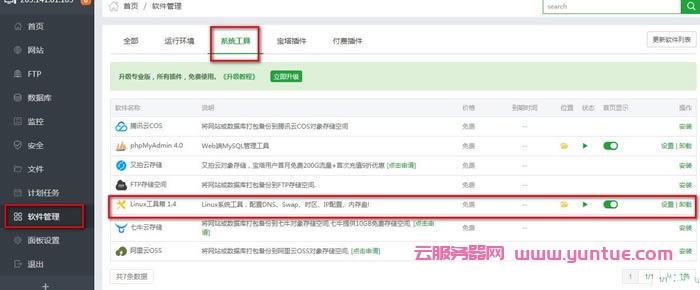 登錄寶塔面板,在左側”軟件管理”里的”系統工具”找到”linux工具箱1.4″,如果沒有安裝,安裝下免費插件,官方的放心使用。