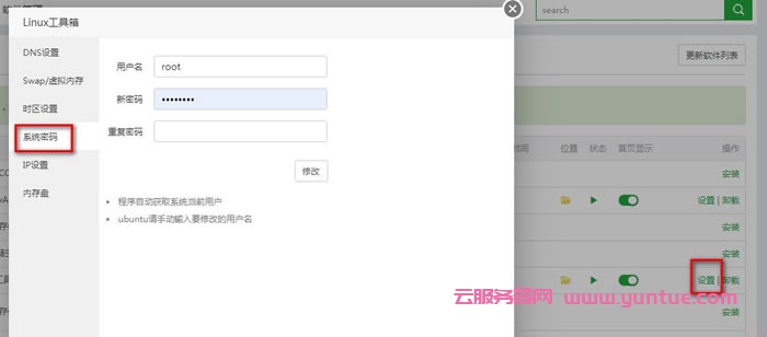 點擊”linux工具箱1.4″右邊的設置,在里面的”系統密碼”這里更改root密碼了。
