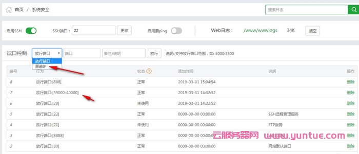 很多時候,有僵尸網絡攻擊我們vps主機,有人掃描我們主機,這個時候我們就有必要封掉他們的ip。對于寶塔面板來說這個功能實現是非常容易的,依然是在”安全”里的”端口控制”里面選擇”屏蔽IP”然后在后面輸入你要屏蔽的ip或者ip段,右側有舉例說明,照做就好。